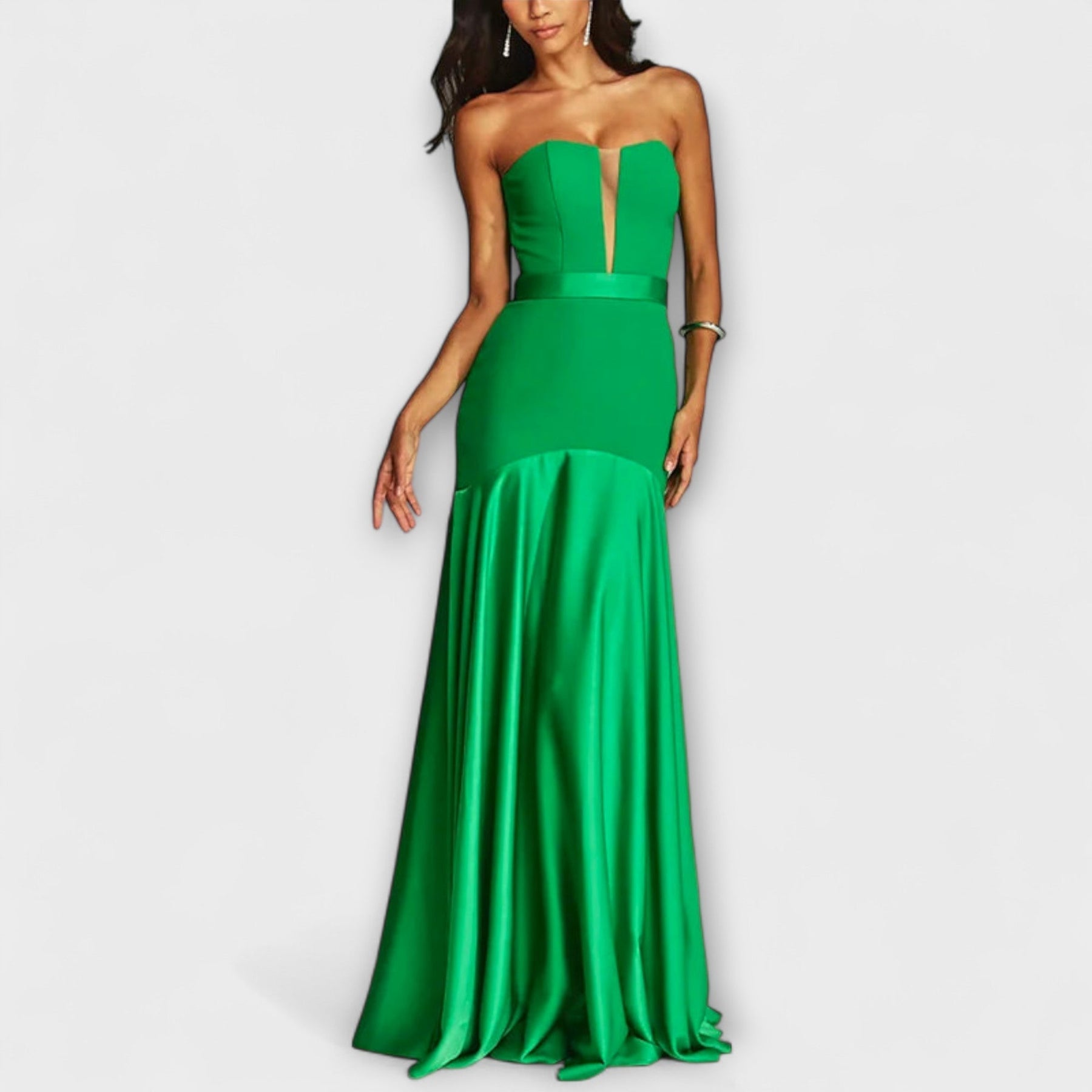 Elevate your style with our stunning ankle-length dress designed to make a statement at any party. Made from high-quality polyester, this dress features a elegant off-shoulder design and a deep sheer V-neck that adds a touch of elegance to your look.